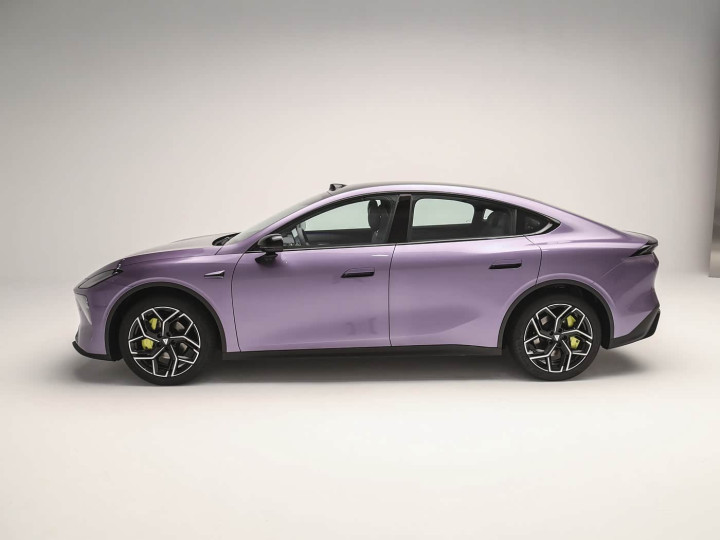 再来看车身侧面部分,车身侧面完美诠释了 “流动美学”,长引擎盖与溜背车顶形成流畅的黄金比例,腰线从翼子板贯穿至尾灯,如液态金属奔涌。细节方面,新车半隐藏式门把手、5mm 超窄无边框外后视镜降低风噪,19 英寸多辐轮辋搭配绿色刹车卡钳,运动气息扑面而来。4830/1905/1480mm 的长宽高与 2900mm 轴距,在保持低趴姿态的同时,为内部空间奠定基础,前后轮距 1630/1650mm 的宽体设计,进一步提升行驶稳定性。